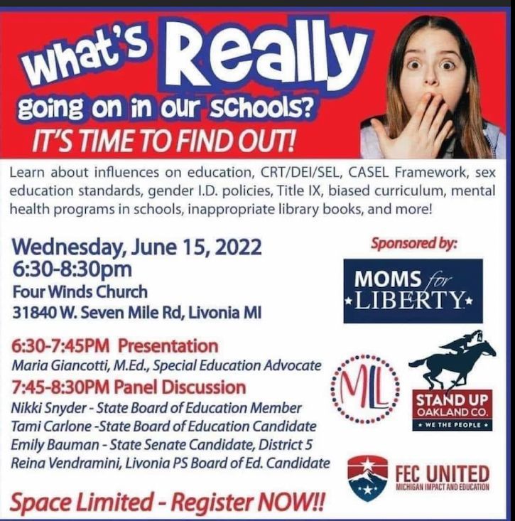 Moms for Liberty was born out of the manufactured CRT (critical race theory) panic in 2020/2021 (intentionally made up by Christopher Rufo), which, after being debunked, has evolved into attacks against "woke" DEI. Notice how the broad topic of DEI isn't too "overbroad" for the Moms. They believe they've nailed it. They intentionally set aside all of the ways equity and inclusion support special education students and other learners we need to better serve for educational success in Michigan. To Parental Rights groups, DEI very clearly means Black or diverse groups.
